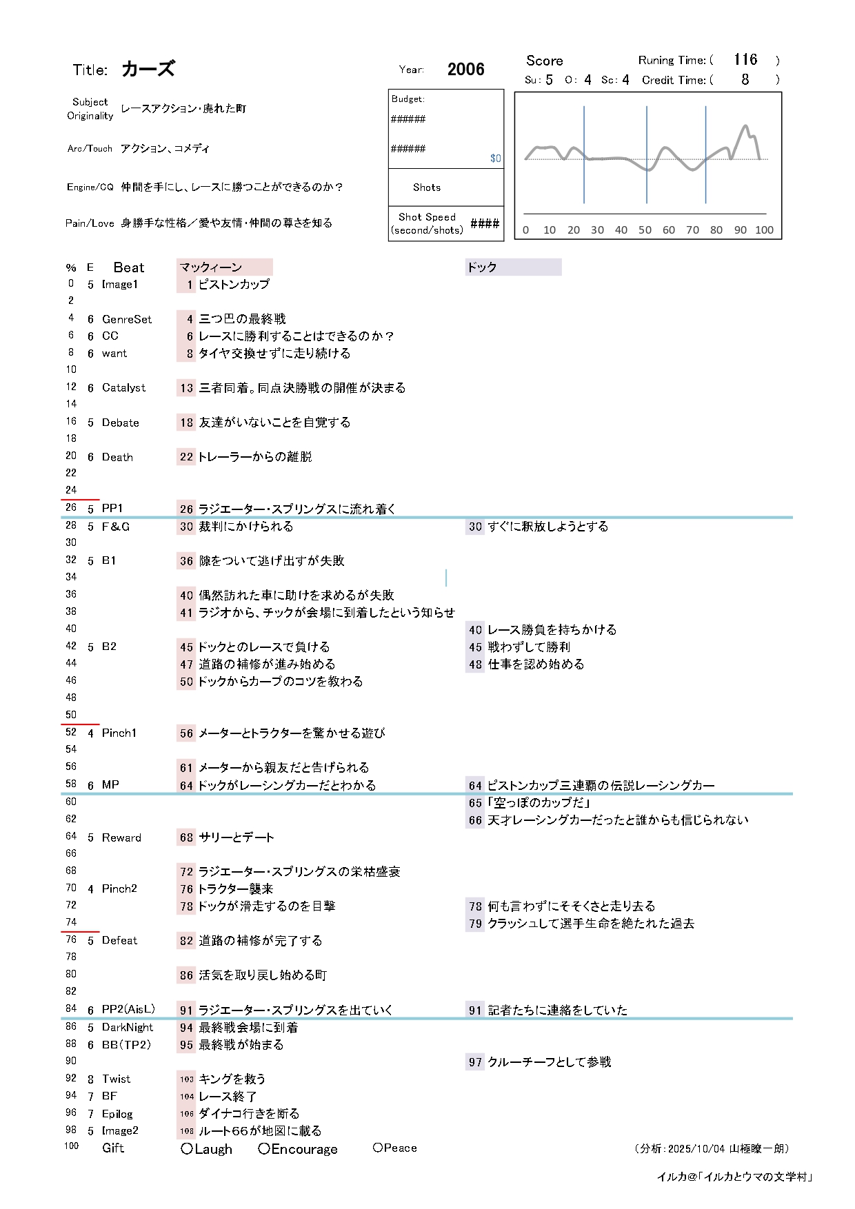 ACT2前半にラジエーター・スプリングスの面々をいろいろと描いていることにより、ミッドポイントが遅れたか。本作においてメーターはそこまで重要な立ち位置ではなく、トラクターを驚かせるシーンなど、省ける要素はあったかに思われる。