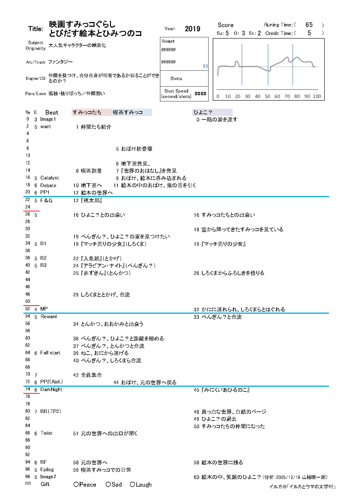 また、キャラクターコンテンツを映画化している以上、すみっコたちが変化する=キャラクターアークを描くのは難しい。すみっコたちの性格などは決まり切っているため、成長することはないし、いちファンとしては、変化してほしいとも思わない。一方で本作を分析したとき、キャラクターアークを描ける要素はあると感じた。それは本作のゲストであるひよこ?だ。おうち探しやアイデンティティを見つけるというテーマと密接に関わるキャラクターである。しかし、全体としての登場シーンが多くなく、丁寧に変化を描けているとは言い難い。絵本の世界に残る決断をする展開はぐっとくるものがあるため、もったいないように感じる。ひよこ?のwantのセットアップ不足によるところがあるか。おうちを探したいと言い出したのはひよこ?ではない。