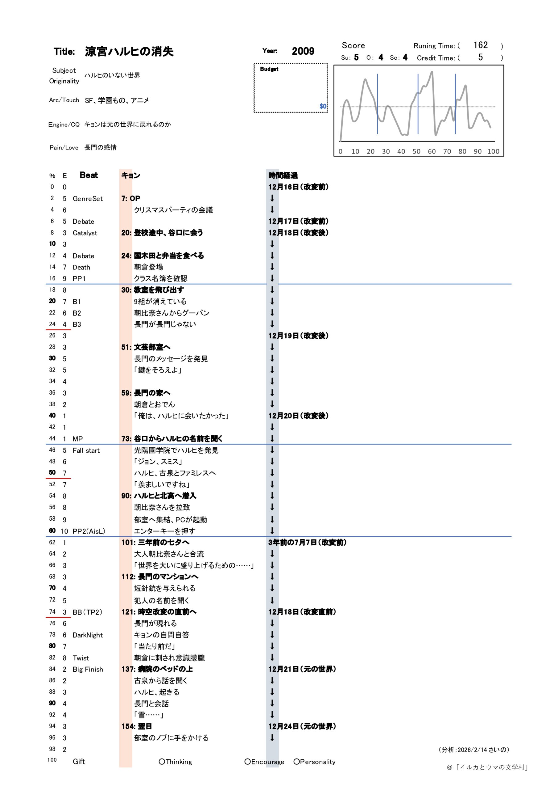 「涼宮ハルヒ」シリーズ初の劇場版アニメーション作品。原作の中でも屈指の人気を誇る同名ライトノベルをほぼ丸ごと劇場作品として再構成。全編162分という異例の長さながら、観るものを飽きさせない確かな魅力を持つ作品へとまとめ上げている。ビート観点で見ても基本的には王道のビート進行に当てはめることができ、作品としての強度を支えている。ハルヒではなく長門有希にフィーチャーしている点や、ハルヒのいないIF世界の魅力を描いている点、それでも最後は主人公・キョンが「ハルヒのいる世界」を主体的に選択する結末を辿る点など、全ての趣向がテレビアニメシリーズをフリとしたもので、その集大成として相応しい内容になっている。